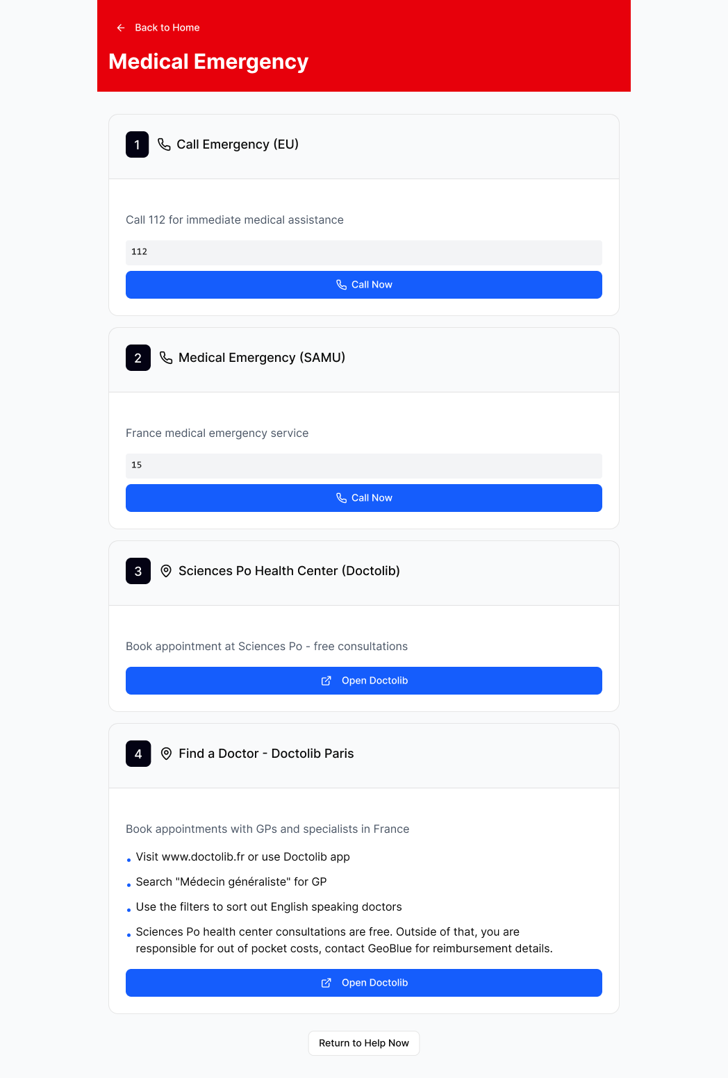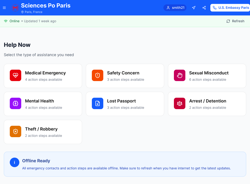 After selecting their school, students can see seven categories of problems, and select the category that matches their issue best. The number of the closest U.S embassy is on top, so it can be accessed without navigating a drop down.