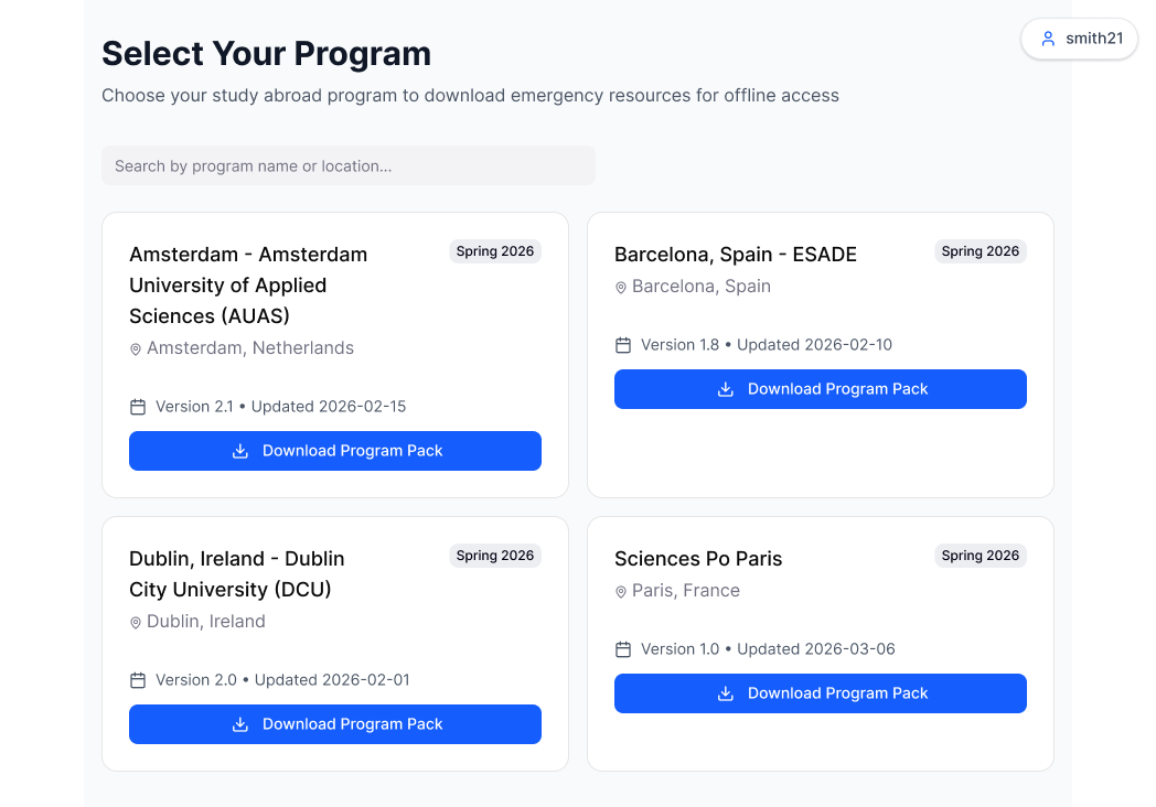 After they login, they get an option to select their study abroad program. If they do not see it here, they can search for it.