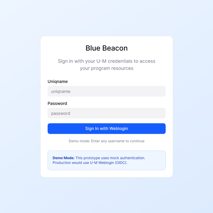The first thing that users see after opening the app is this login page. Students then log in here with their University of Michigan Credentials (uniqname and password)